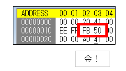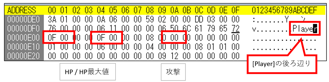 - [0F 00] → [FF 00] : HP255。現在HPとMAXHPがあるので2か所変える。[FF FF]で表示がおかしくなるが65535になる